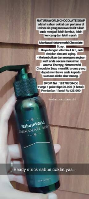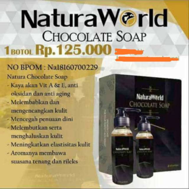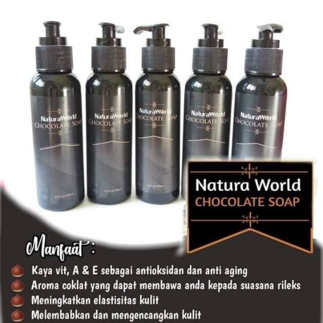 Natura world merupakan sebuah brand kosmetik yang menawarkan beragam jenis produk kecantikan diantaranya ada natura beauty spray natura chocolate soap natura aloe vera shooting gel. Terbuat dari 100 ektrak bengkoang aloevera dll sehingga aman dipakai untuk semua jenis kulit. Naturaworld chocolate soap merupakan sabun cair cokelat pertama di indonesia. Melembutkan dan mengencangkan kulit anda secara maksimal.